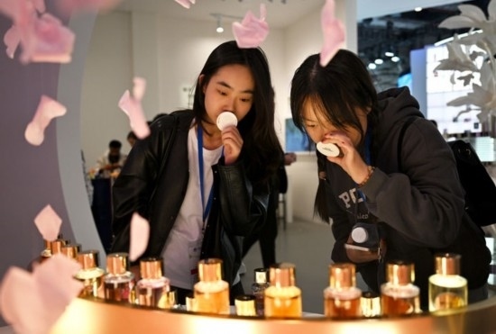 11月9日,觀眾在第七屆進(jìn)博會(huì)歐萊雅展臺(tái)試聞香水。新華社發(fā)(陳浩明 攝)
