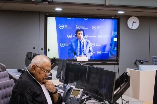 這是3月14日在荷蘭海牙拍攝的國際刑事法院第一預審庭現(xiàn)場,菲律賓前總統(tǒng)杜特爾特以視頻連線方式出席。新華社發(fā)(國際刑事法院供圖)