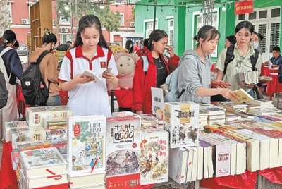 4月9日,越南河內(nèi)大學(xué)孔子學(xué)院學(xué)生在翻閱越南語(yǔ)版的中國(guó)傳統(tǒng)經(jīng)典名著。