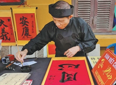 4月13日,在越南河內(nèi)胡志明故居,當(dāng)?shù)貢?shū)法家為中國(guó)游客書(shū)寫(xiě)“同心”。