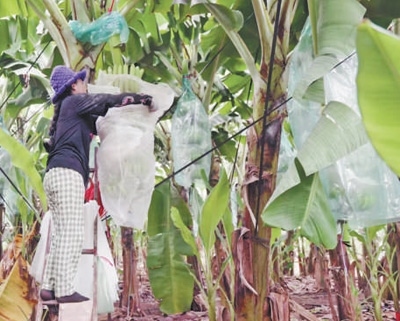 在柬埔寨磅湛省地澤香蕉園,蕉農(nóng)正給香蕉果實(shí)套袋。