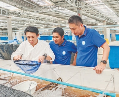 在柬埔寨干丹省一處羅氏沼蝦育苗場(chǎng),上海海洋大學(xué)柬埔寨稻漁項(xiàng)目組成員指導(dǎo)當(dāng)?shù)毓ぷ魅藛T進(jìn)行苗種培育。