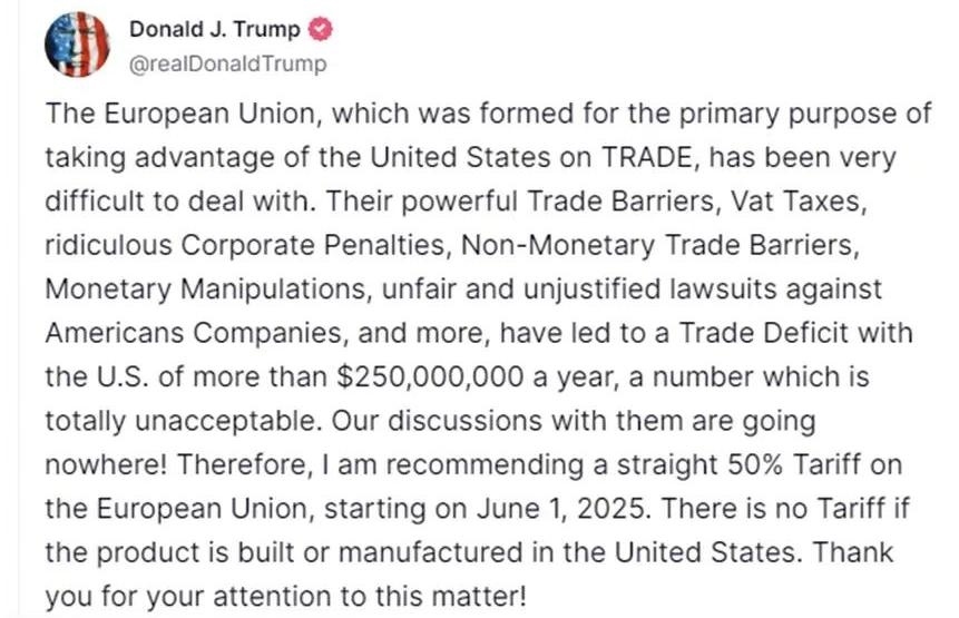 他說,美歐之間的磋商停滯不前?!耙虼?,我建議自2025年6月1日起,對歐盟商品統(tǒng)一征收50%關(guān)稅。若產(chǎn)品在美國本土生產(chǎn)制造,則免征關(guān)稅?!?/p>