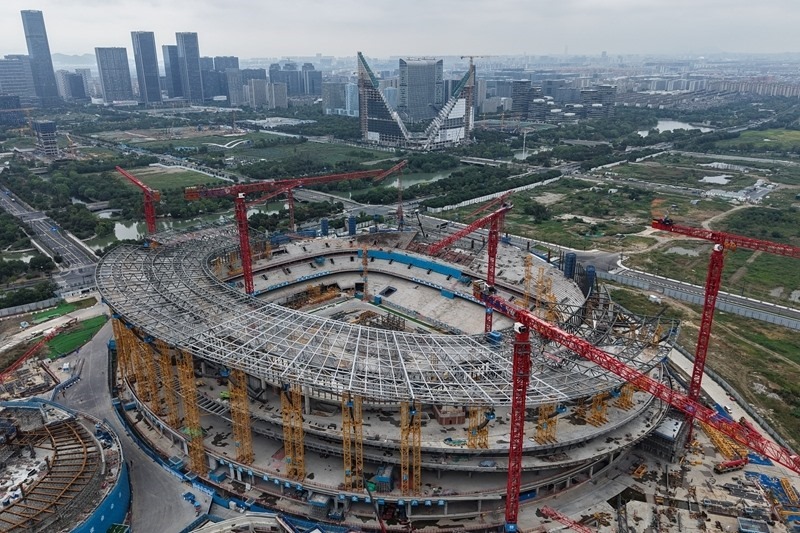 10月21日拍攝的余杭國際體育中心工程足球場項目(無人機(jī)照片)。據(jù)了解,足球場鋼結(jié)構(gòu)設(shè)計總重量達(dá)42000噸,其中屋蓋鋼結(jié)構(gòu)占18000噸。