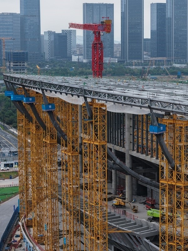 目前,體育館及游泳跳水館工程主體結(jié)構(gòu)全面封頂,已進(jìn)入大規(guī)模鋼結(jié)構(gòu)施工階段;足球場工程鋼屋蓋整體進(jìn)度過半,主體結(jié)構(gòu)已完成90%,項目建設(shè)正穩(wěn)步推進(jìn)。
