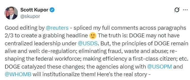 路透社還援引美國人事管理局局長庫珀的消息,稱“政府效率部”已“不存在”,并稱其已不再是一個“集中式機構”。