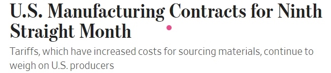 《華爾街日報》1日發(fā)表文章稱,美國供應管理協(xié)會(ISM)當天公布的調(diào)查報告顯示,11月美國制造業(yè)采購經(jīng)理人指數(shù)(PMI)已低于50的榮枯分界線。美國制造業(yè)活動連續(xù)第九個月萎縮,而美國制造商認為這主要是因為美國政府的關稅政策。