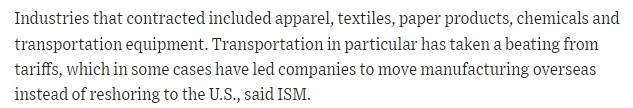 文章指出,美國制造業(yè)活動萎縮的行業(yè)主要包括服裝、紡織品、紙制品、化工產(chǎn)品和運輸業(yè)。文章表示,雖然當前美國工廠產(chǎn)量有所增加,但未售出的庫存卻急劇增加。需求增長放緩,這在出口市場體現(xiàn)尤為明顯,而受關稅影響,出口市場的前景更加暗淡。