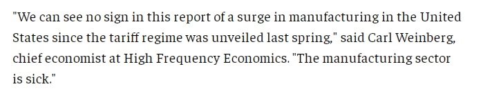 文章指出,美國政府曾辯稱,加征關稅是保護美國國內(nèi)制造業(yè)的必要之舉,但經(jīng)濟學家則認為,由于包括勞動力短缺在內(nèi)的結構性問題,美國制造業(yè)已無法恢復昔日輝煌。文章援引高頻經(jīng)濟咨詢公司首席經(jīng)濟學家卡爾·溫伯格(Carl Weinberg)的話表示,“從(ISM)這份報告中,我沒有看到自關稅政策出臺以來,美國制造業(yè)出現(xiàn)任何增長的跡象,美國制造業(yè)已經(jīng)病了?!?/p>