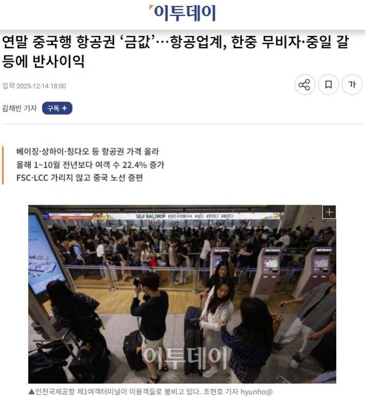 市場(chǎng)旺盛的需求直接傳導(dǎo)至價(jià)格層面。韓國(guó)《Etoday》近日一篇題為《年底飛往中國(guó)的航班“如同黃金般珍貴”》的報(bào)道,生動(dòng)描繪了當(dāng)前中韓航線的熱度。報(bào)道指出,截至12月中旬,韓國(guó)飛往北京、上海、青島等主要中國(guó)城市的機(jī)票價(jià)格大幅上漲。例如,大韓航空?qǐng)?zhí)飛的首爾-上海往返票價(jià)已漲至約40萬(wàn)韓元,濟(jì)州航空的韓元-青島航線往返票價(jià)也接近30萬(wàn)韓元。業(yè)內(nèi)分析指出,即便考慮季節(jié)性因素,當(dāng)前票價(jià)仍比去年同期高出約20%。來(lái)往中韓“一票難求”,華燈初上的明洞和外灘,熱氣騰騰的烤肉與火鍋,游客們的熱情互動(dòng)給這個(gè)寒冷的冬天帶來(lái)暖意。