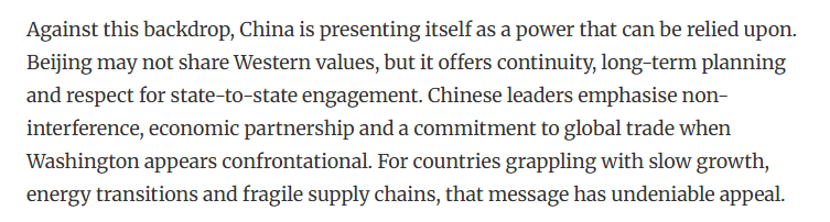 文章認為,在此背景下,中國是可靠力量。中國提供了連續(xù)性、長期規(guī)劃和尊重國家間的交流。中國強調不干涉、經濟伙伴關系和對維護全球貿易。對于那些正面臨增長緩慢、能源轉型和供應鏈脆弱的國家來說,這一主張具有不可否認的吸引力。另外,中國與美國不同,中國并不要求合作時必須實現意識形態(tài)上的一致性。中國提供市場、投資和交流。在不確定的時代,這些反而更體現了一種穩(wěn)定。