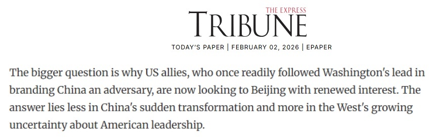 巴基斯坦《論壇快報》2日的一篇文章指出,為何曾緊跟華盛頓將中國視為“對手”的西方盟友們,如今對中國重燃興趣?答案不是中國的突然轉變,而是西方對美國不確定性日益加深的疑慮。