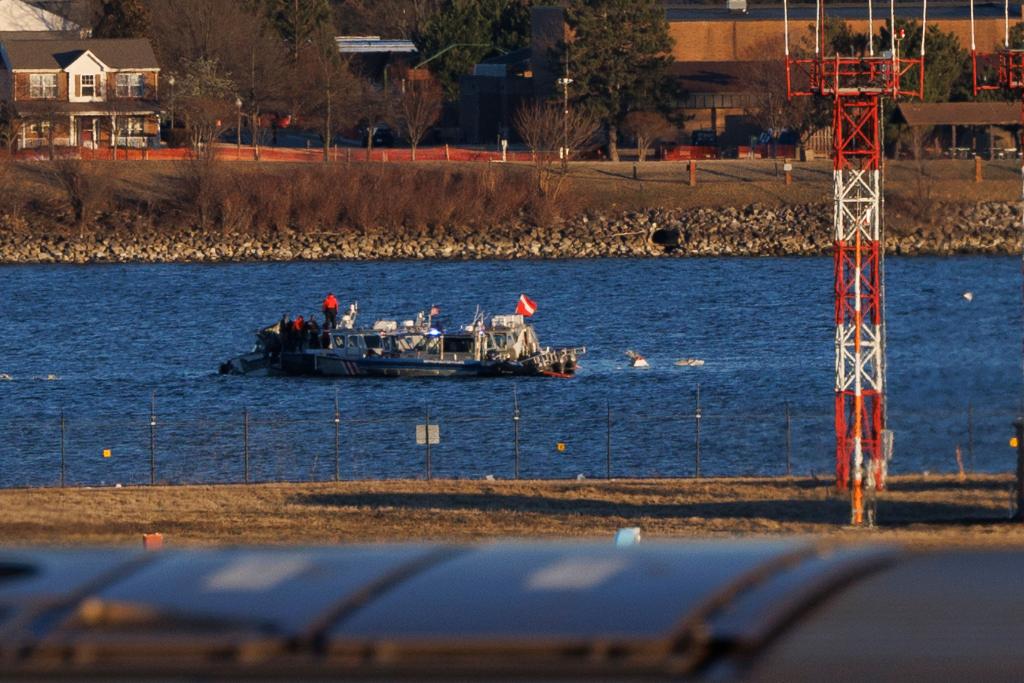 2025年2月1日,工作人員在美國華盛頓里根國家機(jī)場(chǎng)旁的波托馬克河上打撈飛機(jī)殘骸。新華社發(fā)(亞倫攝)