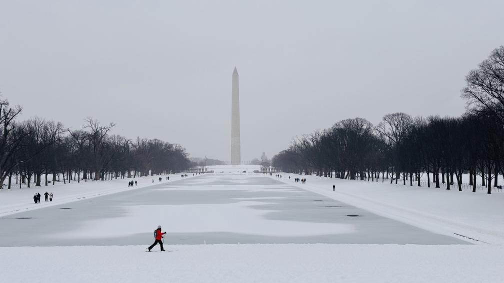 1月25日,人們?cè)诿绹锥既A盛頓林肯紀(jì)念堂倒影池旁的雪中行走。新華社記者徐劍梅攝