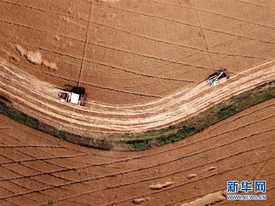6月2日,在合肥市蜀山區(qū)小廟鎮(zhèn)馬崗村,農機手操作機械設備收割小麥(無人機照片)。 “三夏”時節(jié),安徽各地麥收進入高峰期,農民搶收小麥,確保顆粒歸倉。新華社記者劉軍喜攝