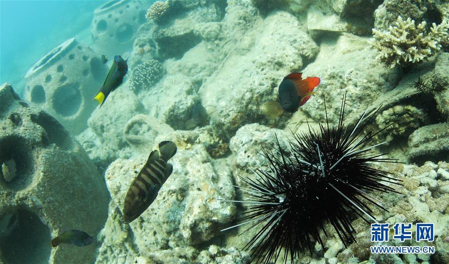 在海南三亞蜈支洲島海域,魚兒在海洋牧場的人工魚礁附近覓食(3月28日攝)。新華社記者楊冠宇攝