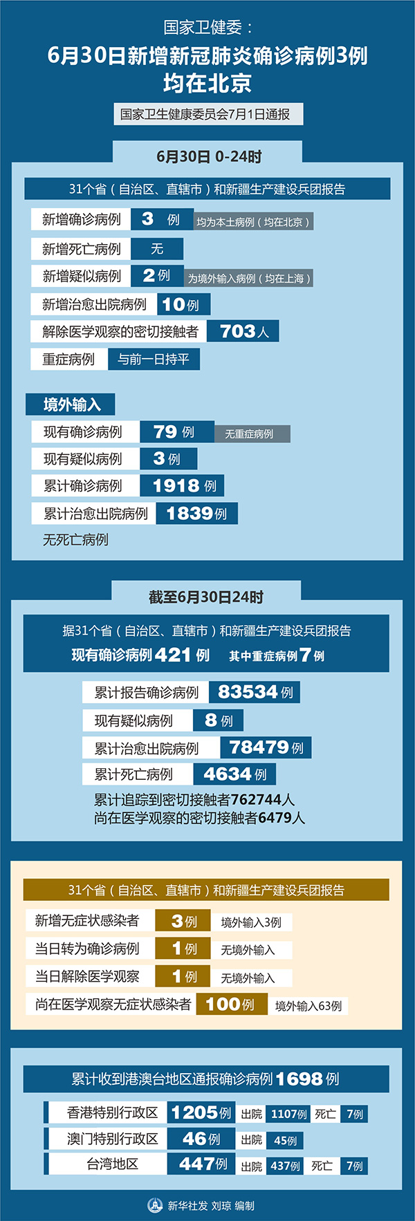 截至6月30日24時(shí),據(jù)31個(gè)省(自治區(qū)、直轄市)和新疆生產(chǎn)建設(shè)兵團(tuán)報(bào)告,現(xiàn)有確診病例421例(其中重癥病例7例),累計(jì)治愈出院病例78479例,累計(jì)死亡病例4634例,累計(jì)報(bào)告確診病例83534例,現(xiàn)有疑似病例8例。累計(jì)追蹤到密切接觸者762744人,尚在醫(yī)學(xué)觀察的密切接觸者6479人。