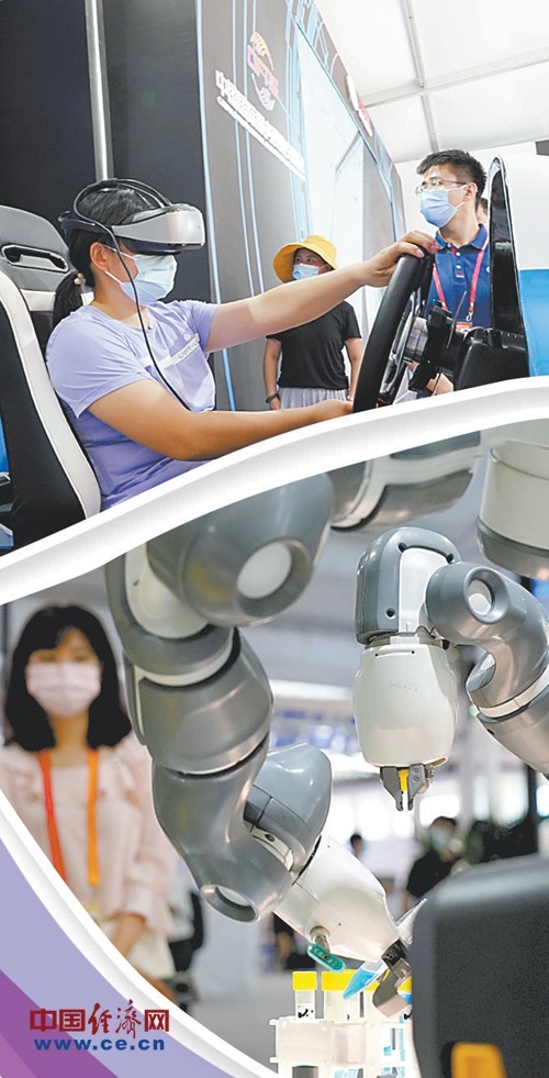 上圖:觀眾在2020服貿(mào)會5G通信服務展區(qū)體驗5G高速網(wǎng)絡帶來的仿真駕駛。下圖:觀眾在2020服貿(mào)會服務機器人展區(qū)參觀醫(yī)用機器人。經(jīng)濟日報-中國經(jīng)濟網(wǎng)記者趙晶攝