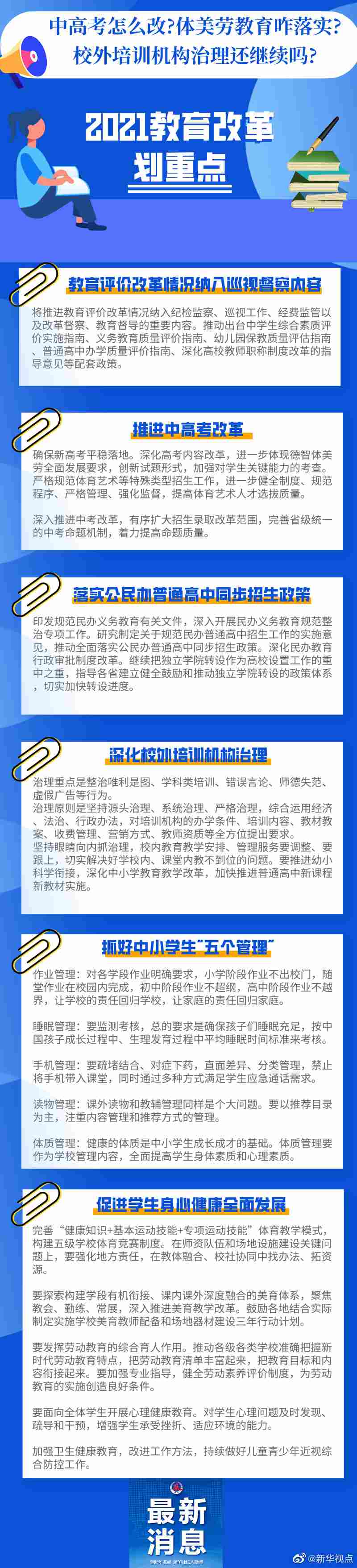中高考怎么改?體美勞教育咋落實(shí)?校外培訓(xùn)機(jī)構(gòu)治理還繼續(xù)嗎?中小學(xué)生作業(yè)、睡眠、手機(jī)、讀物、體質(zhì)都要納入管理?這些社會(huì)關(guān)心的熱點(diǎn),在2021年教育發(fā)展改革中都將涉及。記者梳理教育部部長(zhǎng)陳寶生在2021年全國(guó)教育工作會(huì)議上的講話,及《教育部2021年工作要點(diǎn)》,為你劃出以下重點(diǎn)。詳情請(qǐng)見大圖↓↓(記者胡浩)