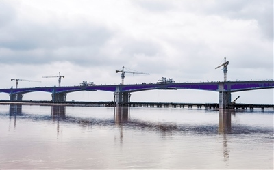 10月5日凌晨,由內(nèi)蒙古高路公司投資,中交二公局承建,包茂高速公路昭君黃河特大橋主橋雙幅順利合龍。昭君黃河特大橋橫亙于黃河,氣勢(shì)宏偉,蔚為壯觀,大橋采用雙向4車道高速公路標(biāo)準(zhǔn)建設(shè),全長(zhǎng)4300米,分北岸灘橋、北岸跨堤橋、主橋、南岸灘橋、南岸跨堤橋五部分。(王曉博 攝)
