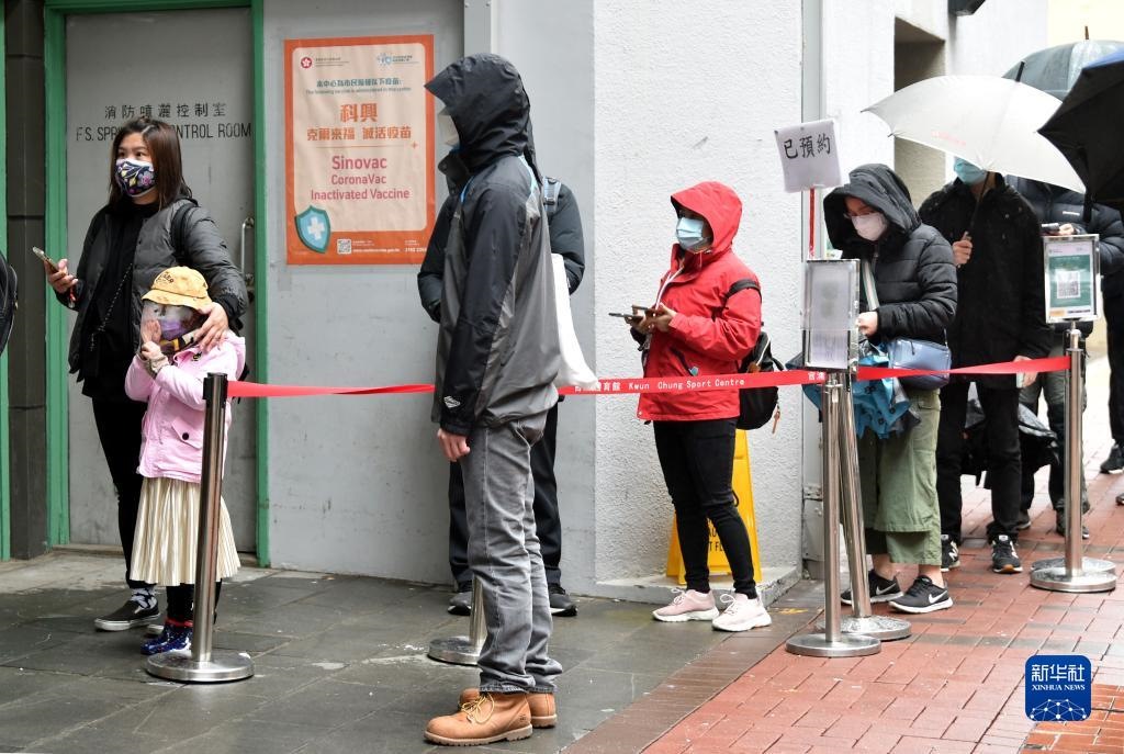 2月22日,在香港佐敦疫苗接種中心站,市民佩戴口罩排隊(duì)接種疫苗。新華社記者 盧炳輝 攝
