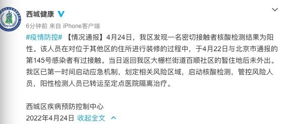 4月24日,我區(qū)(北京市西城區(qū))發(fā)現(xiàn)一名密切接觸者核酸檢測結(jié)果為陽性。該人員在對位于其他區(qū)的住所進行裝修的過程中,于4月22日與北京市通報的第145號感染者有過接觸。當日返回我區(qū)大柵欄街道百順社區(qū)的暫住地后未外出。