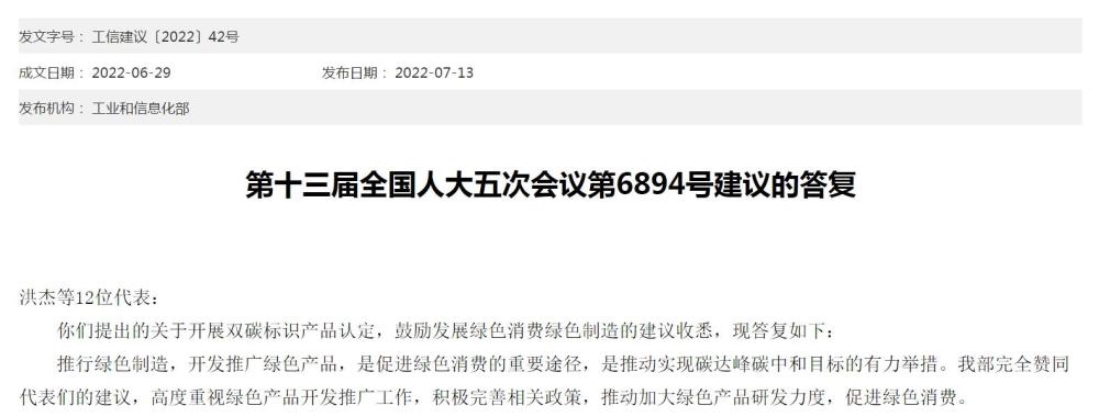 在答復(fù)中,工信部表示,推行綠色制造,開發(fā)推廣綠色產(chǎn)品,是促進(jìn)綠色消費(fèi)的重要途徑,是推動(dòng)實(shí)現(xiàn)碳達(dá)峰碳中和目標(biāo)的有力舉措。工信部完全贊同代表們的建議,高度重視綠色產(chǎn)品開發(fā)推廣工作,積極完善相關(guān)政策,推動(dòng)加大綠色產(chǎn)品研發(fā)力度,促進(jìn)綠色消費(fèi)。