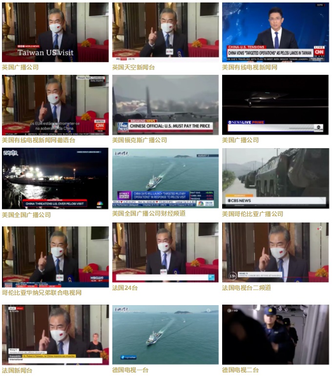 總臺國際視頻通訊社聚焦外交部、國臺辦、東部戰(zhàn)區(qū)等權威表態(tài),可視化制作編發(fā)《國際銳評》《玉淵譚天》等相關評論言論。截至8月4日10時,共有84條新聞素材得到BBC、CNN、CNBC、英國天空新聞臺、法國24臺、法國電視臺、法國新聞臺、德國電視一臺、德國電視二臺、德國之聲、意大利廣播電視公司、意大利TGCOM24電視臺、加拿大廣播公司、加拿大最大的商業(yè)電視網(wǎng)CTV、俄羅斯第一頻道、全俄國家電視廣播公司、日本NHK、韓國KBS、巴西環(huán)球電視臺、印度國家電視臺、新加坡亞洲新聞臺、澳大利亞廣播公司、卡塔爾半島電視臺、墨西哥阿茲特克電視臺、印尼國家廣播電視臺等102個國家和地區(qū)的1683個電視臺及新媒體平臺采用。國際視頻通訊社還特別面向中國臺灣地區(qū)的媒體進行精準投送,實現(xiàn)臺灣地區(qū)主流電視臺全覆蓋,落地效果突出:臺灣東森電視臺、臺灣無線衛(wèi)星電視臺(TVBS)、臺灣中華電視臺、臺灣中天電視臺等共有13個臺灣電視臺及采用播出744次,播出總時長3小時26分44秒。
