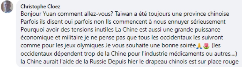 法語網(wǎng)友克羅茲:“臺灣始終是中國的一個省,美國人一會兒承認一會兒又不承認,現(xiàn)在他們又開始搗亂。為什么要制造這種毫無意義的緊張氣氛呢?中國是一個經濟和軍事大國,我不認為西方會跟著美國走,就像之前的奧運會一樣,西方國家太依賴于中國工業(yè)了。俄羅斯應該是支持中國的吧,昨天紅場上方都飄著中國國旗?!?/p>