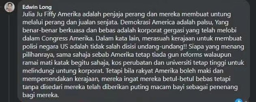 馬來西亞網(wǎng)友Edwin Long留言:“美國就是戰(zhàn)爭販子,他們通過戰(zhàn)爭和販賣武器獲利。美國的民主只是假象,真正享有權力和自由的是在幕后主導國會的大企業(yè)。換句話說,官商勾結在美國的法律上是被允許的!無論誰贏得選舉,一樣不會禁槍,醫(yī)療和教育成本還是不會下降,因為要維護大企業(yè)的利益。但是他們的人民覺得他們能罵政府就是自由的,全然沒有意識到這不過是安撫奶嘴罷了。”