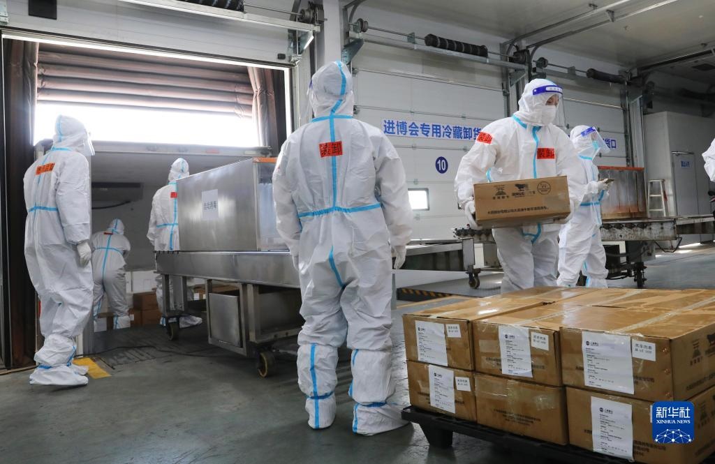10月20日上午9點(diǎn),第五屆中國國際進(jìn)口博覽會(huì)的第一批進(jìn)口冷鏈?zhǔn)称氛蛊繁贿\(yùn)入總倉。在接下來的10天內(nèi),預(yù)計(jì)約100個(gè)全球參展商、3000箱冷鏈?zhǔn)称氛蛊?,將在總倉集中完成“最小包裝”消毒和核酸檢測(cè)。