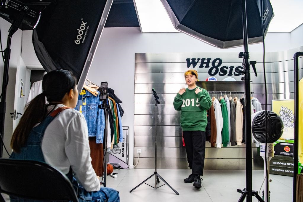 在重慶市渝中區(qū)由工業(yè)遺址改造成的“一廠影視園”一家國(guó)潮品牌公司內(nèi),創(chuàng)業(yè)者通過(guò)手機(jī)直播銷(xiāo)售商品(2022年9月27日攝)。新華社記者唐奕攝