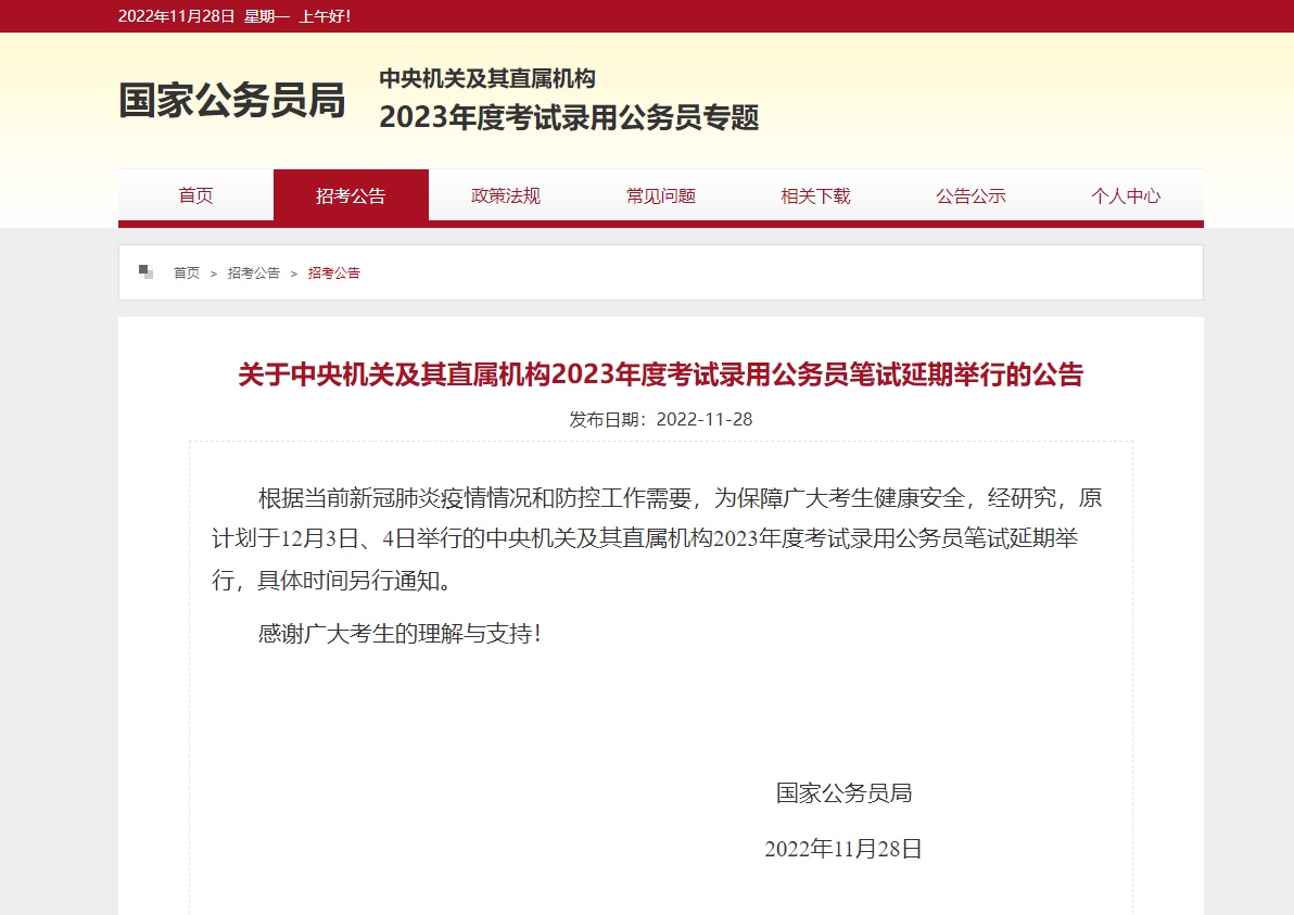 ??根據(jù)當前新冠肺炎疫情情況和防控工作需要,為保障廣大考生健康安全,經(jīng)研究,原計劃于12月3日、4日舉行的中央機關及其直屬機構2023年度考試錄用公務員筆試延期舉行,具體時間另行通知。