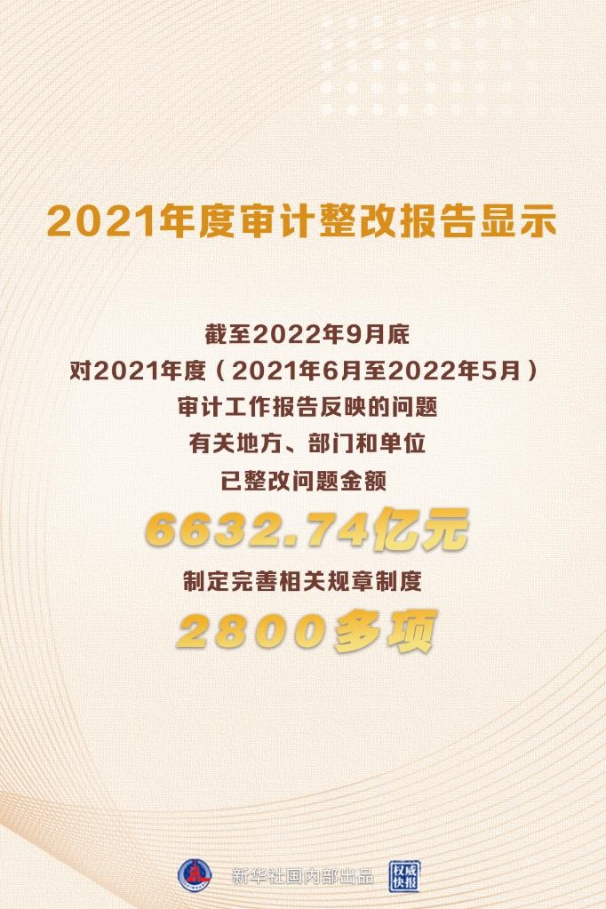 新華社北京12月28日電(記者鄒多為)報告顯示,截至2022年9月底,對于2021年度(2021年6月至2022年5月)審計工作報告反映的問題,有關地方、部門和單位已整改問題金額6632.74億元,制定完善相關規(guī)章制度2800多項,追責問責1.4萬人,糾治了一些阻礙改革發(fā)展和長期未解決的頑瘴痼疾。