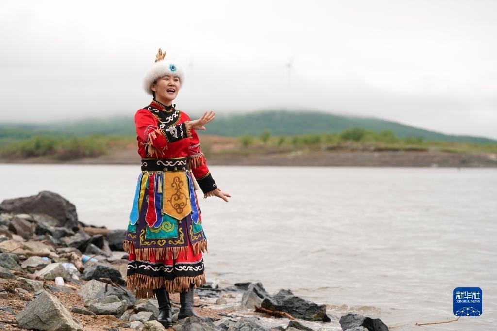 在黑龍江省同江市街津口赫哲族鄉(xiāng)漁業(yè)村附近的黑龍江江畔,劉蕾展示一段赫哲族歌舞(2022年5月21日攝)。新華社記者 王建威 攝