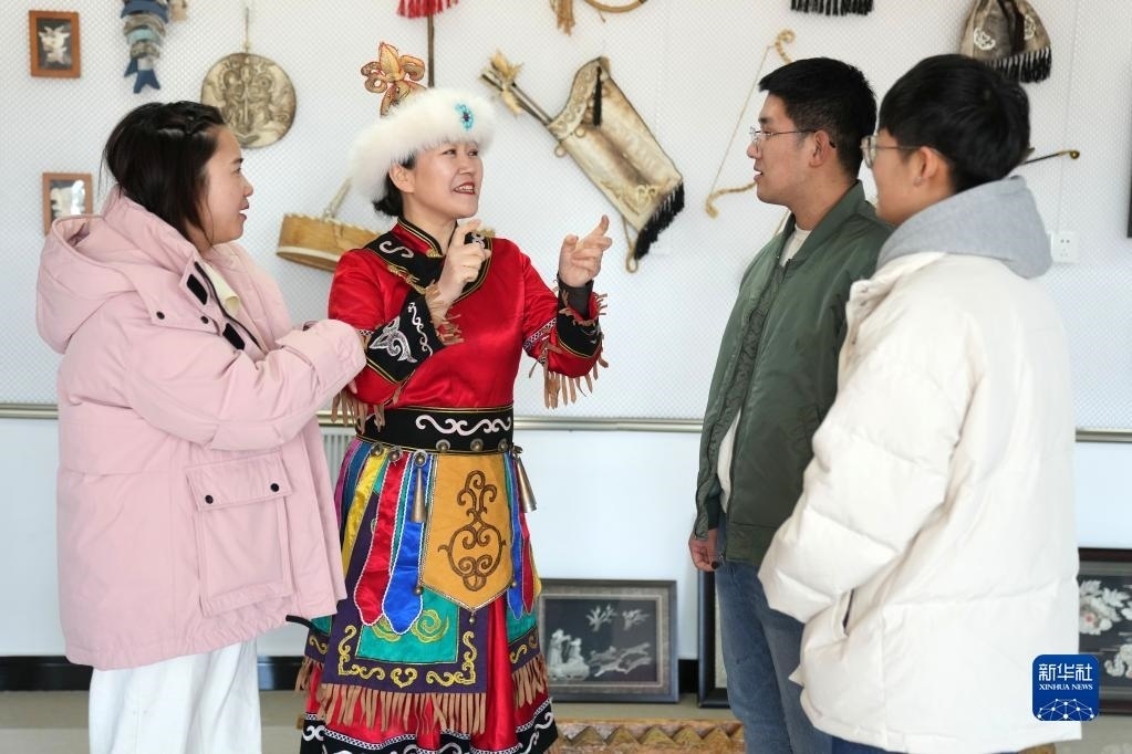 2月23日,在黑龍江省同江市八岔赫哲族鄉(xiāng)八岔村伊瑪堪傳習所,劉蕾(左二)與年輕人交流。新華社記者 王建威 攝