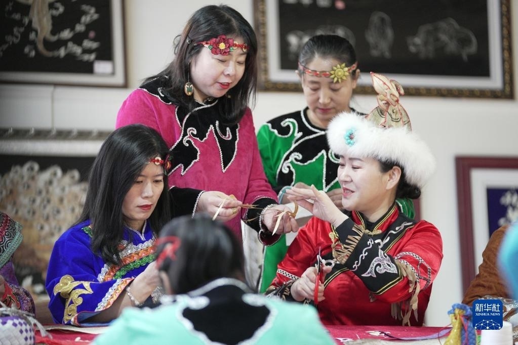 2月22日,在黑龍江省同江市非物質文化遺產展示館,劉蕾(右一)在學習魚皮制作技藝。新華社記者 王建威 攝