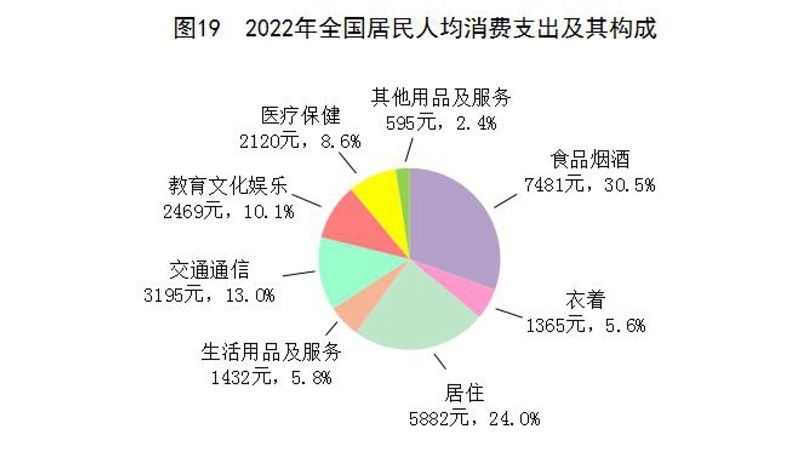 全年全國居民人均消費(fèi)支出24538元,比上年增長1.8%,扣除價格因素,實(shí)際下降0.2%。其中,人均服務(wù)性消費(fèi)支出[54]10590元,比上年下降0.5%,占居民人均消費(fèi)支出的比重為43.2%。按常住地分,城鎮(zhèn)居民人均消費(fèi)支出30391元,增長0.3%,扣除價格因素,實(shí)際下降1.7%;農(nóng)村居民人均消費(fèi)支出16632元,增長4.5%,扣除價格因素,實(shí)際增長2.5%。全國居民恩格爾系數(shù)為30.5%,其中城鎮(zhèn)為29.5%,農(nóng)村為33.0%。