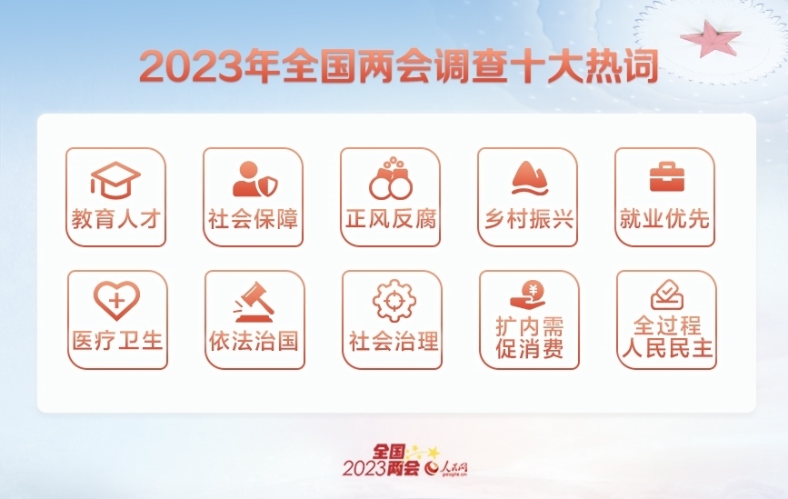 經(jīng)過網(wǎng)友投票,“教育人才”“社會保障”“正風(fēng)反腐”“鄉(xiāng)村振興”“就業(yè)優(yōu)先”“醫(yī)療衛(wèi)生”“依法治國”“社會治理”“擴(kuò)內(nèi)需促消費(fèi)”“全過程人民民主”入選十大熱詞。