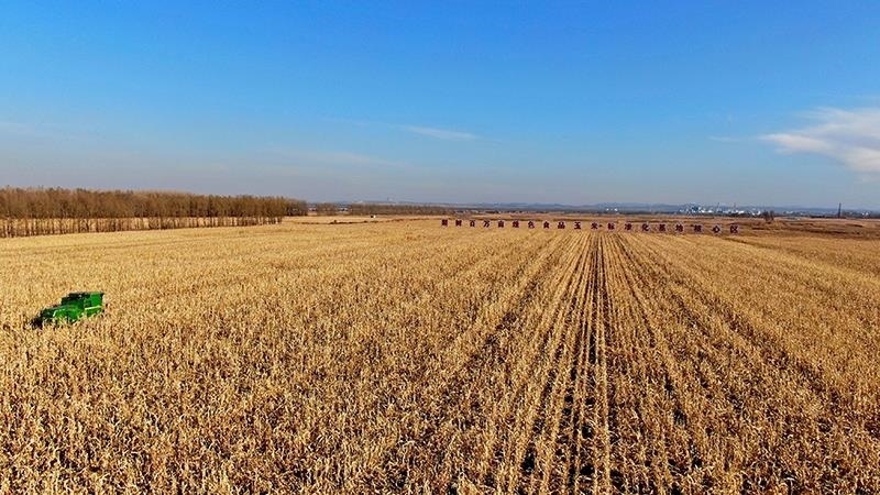 △2022年10月28日,在四平市梨樹縣國家百萬畝綠色食品原料(玉米)標(biāo)準(zhǔn)化生產(chǎn)基地核心示范區(qū),農(nóng)民駕駛農(nóng)機(jī)進(jìn)行秋收作業(yè)。
