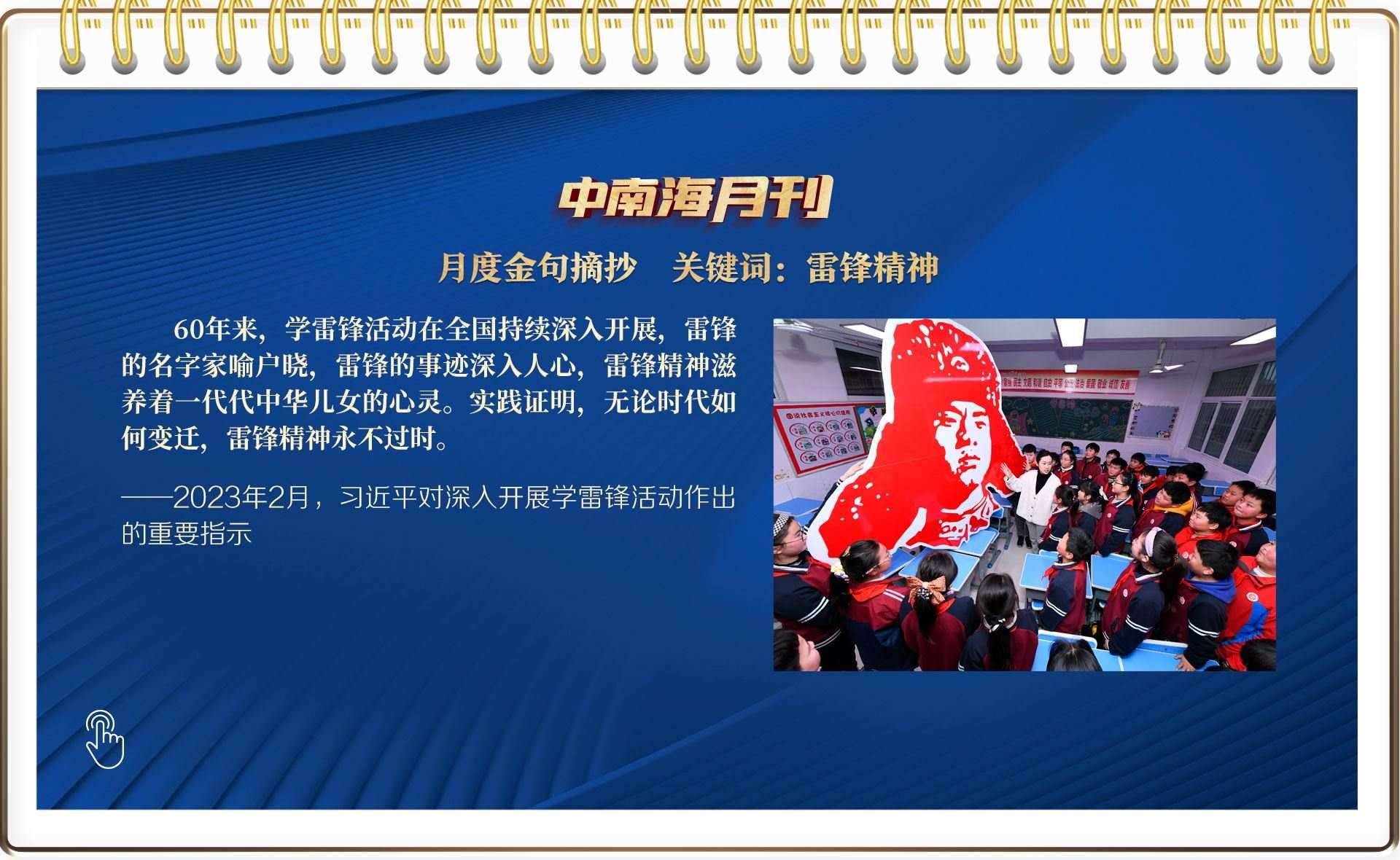 2月“關(guān)聯(lián)人物”中,雷鋒的名字家喻戶曉。在毛澤東等老一輩革命家為雷鋒同志題詞60周年之際,習(xí)近平總書記作出重要指示,一語道出了雷鋒精神的歷史厚度:“實(shí)踐證明,無論時(shí)代如何變遷,雷鋒精神永不過時(shí)?!?/p>