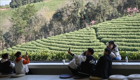 △游客在浙江省安吉縣黃杜村萬(wàn)畝茶園邊的咖啡館留影(2月21日攝)。