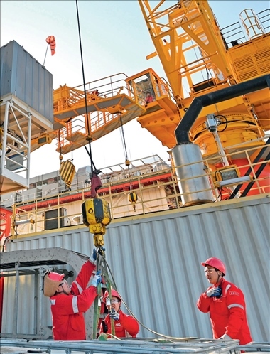 ▲ 埕海一號海上采油平臺工作人員在平臺甲板進行吊裝作業(yè)(2023年1月16日攝) 趙子碩攝