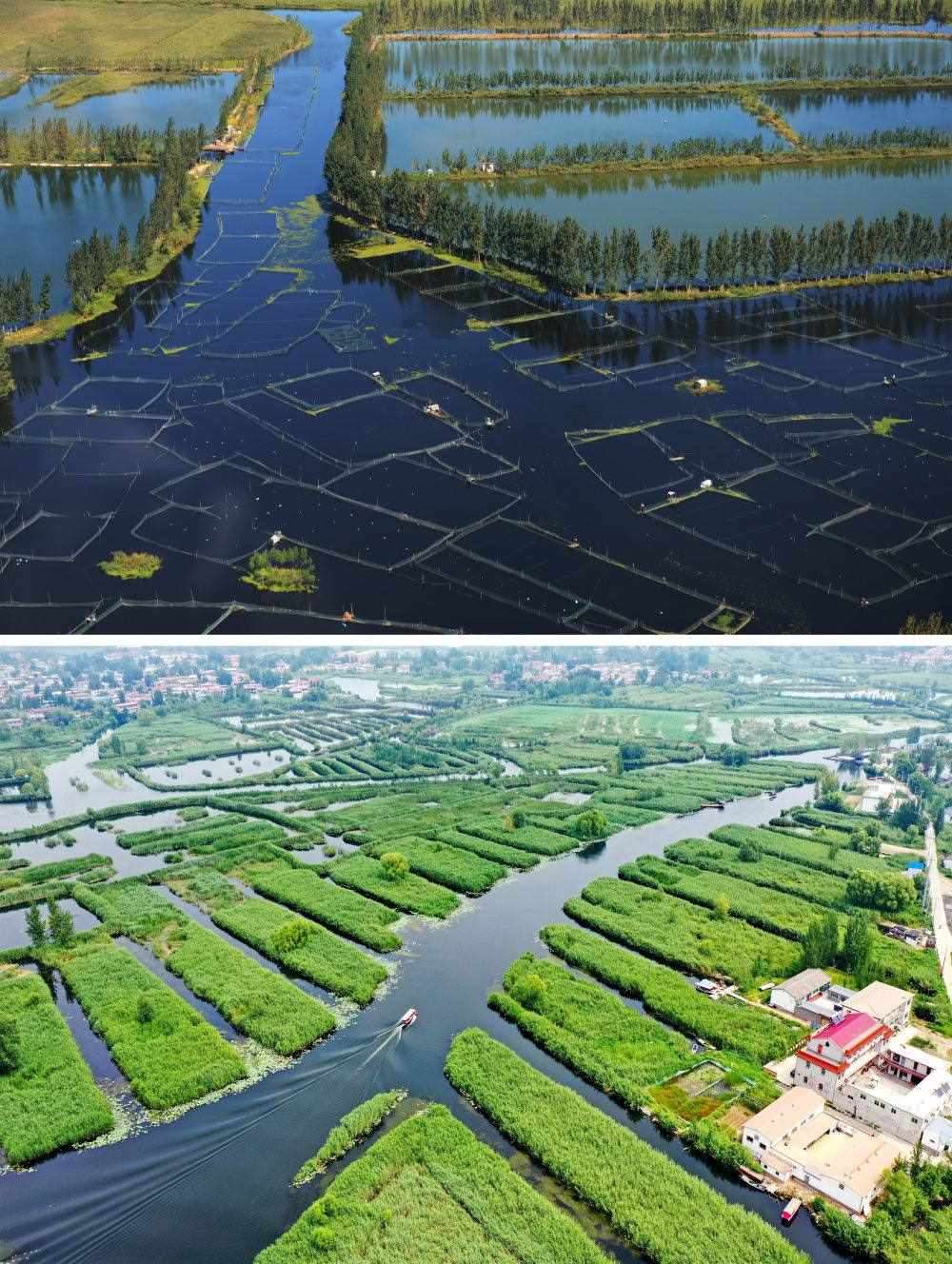 拼版照片:上圖為2012年9月29日拍攝的白洋淀(金潔 攝);下圖為2021年8月14日拍攝的白洋淀風光(無人機照片,新華社記者牟宇攝)。
