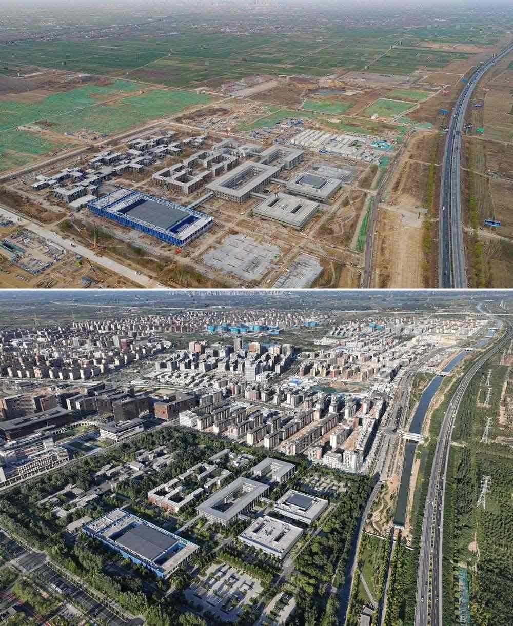 拼版照片:上圖為2018年3月29日拍攝的雄安市民服務中心(無人機照片);下圖為2022年9月6日拍攝的雄安市民服務中心(無人機照片)。