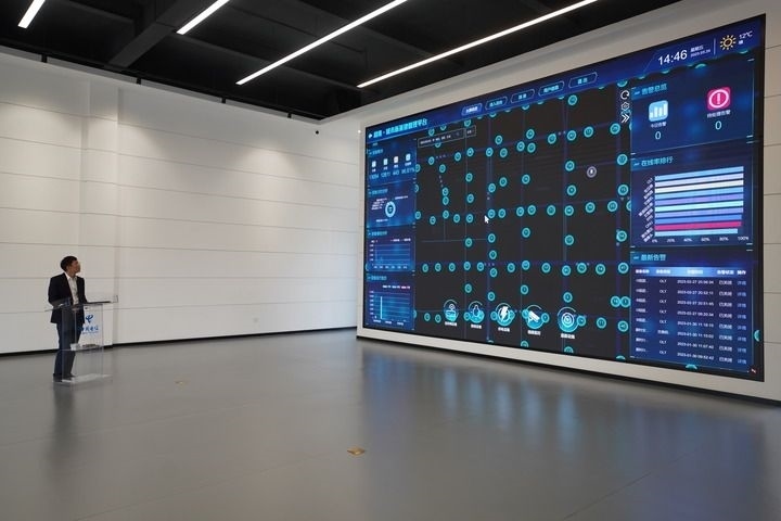 河北雄安新區(qū)中國電信智慧城市產(chǎn)業(yè)園的工作人員展示數(shù)字道路運營系統(tǒng)(3月24日攝)。