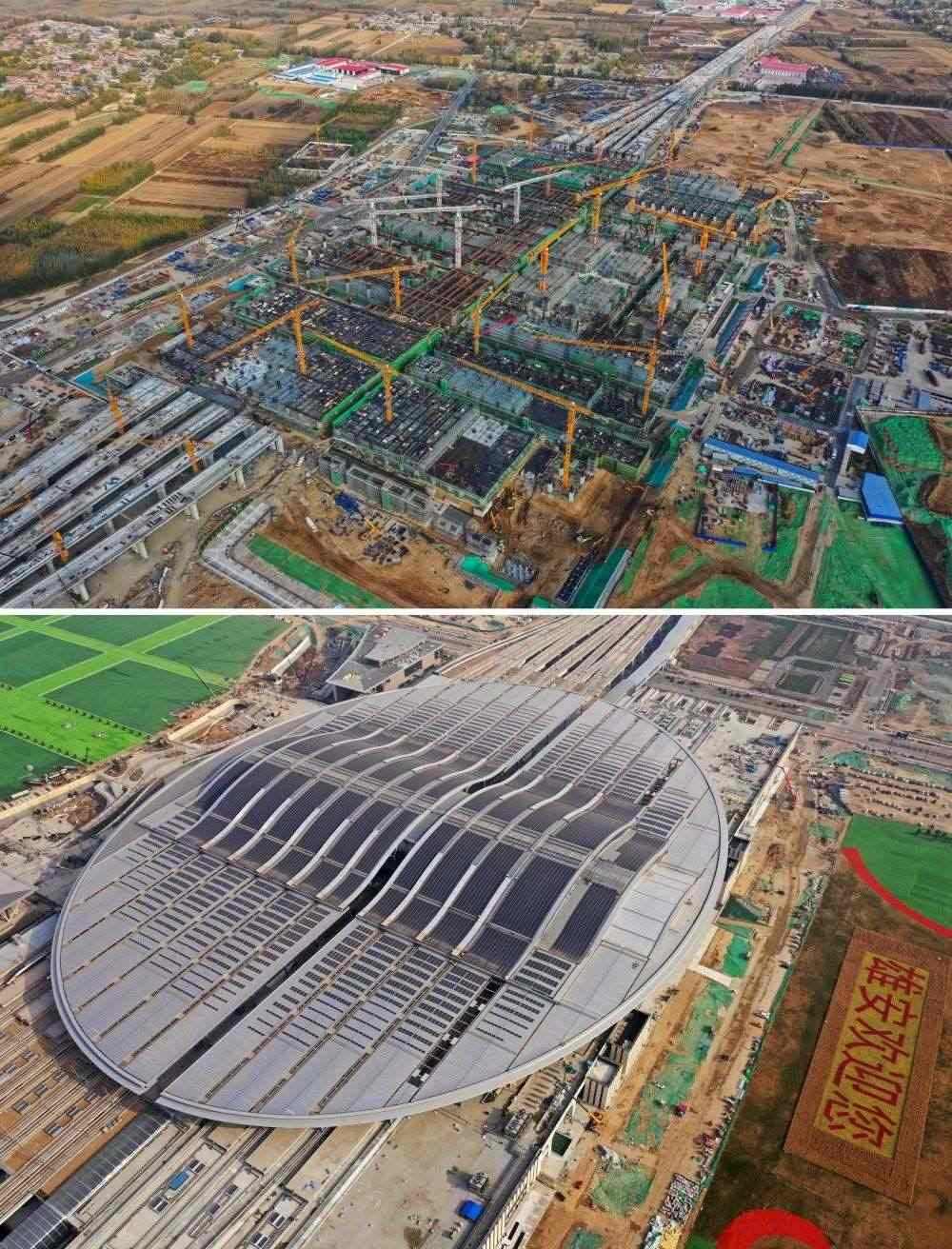 拼版照片:上圖為建設中的雄安站(無人機照片,2019年11月7日攝);下圖為建成的雄安站(無人機照片,2021年4月1日攝)。