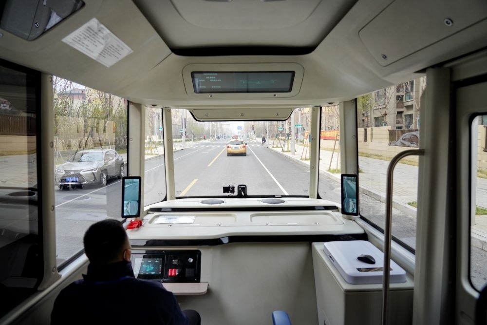 3月20日,智能網(wǎng)聯(lián)巴士901線測試車在河北雄安新區(qū)容東片區(qū)道路上行駛。