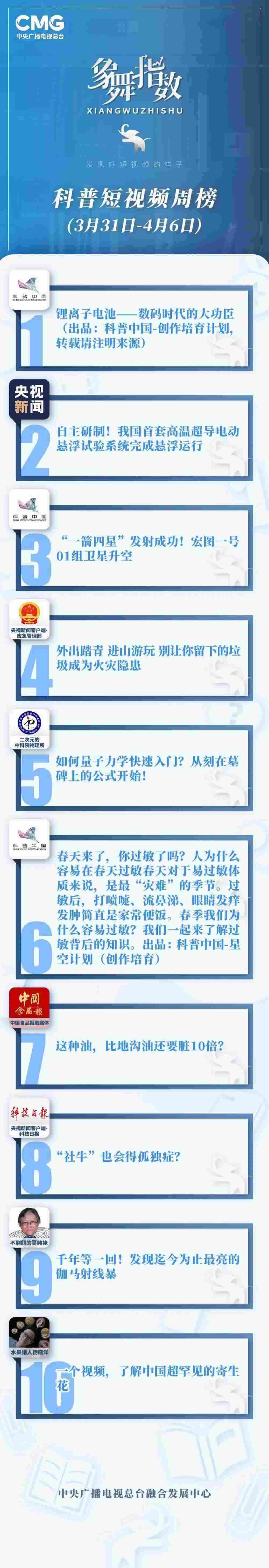 中央廣播電視總臺(tái)“象舞指數(shù)”評(píng)議品牌,推出科普短視頻周榜、總臺(tái)科普短視頻周榜。在2023年3月31日-4月6日,值得注目的內(nèi)容有: