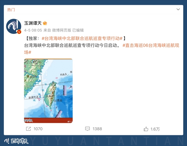 多家主流媒體轉(zhuǎn)發(fā)引用,消息瞬間傳遍全網(wǎng)。90余家臺(tái)灣媒體多平臺(tái)轉(zhuǎn)發(fā),揣測(cè)此次巡航活動(dòng)及玉淵譚天配圖釋放的信號(hào)。臺(tái)當(dāng)局就此消息進(jìn)行緊急回應(yīng),美國之音也撰文評(píng)論。